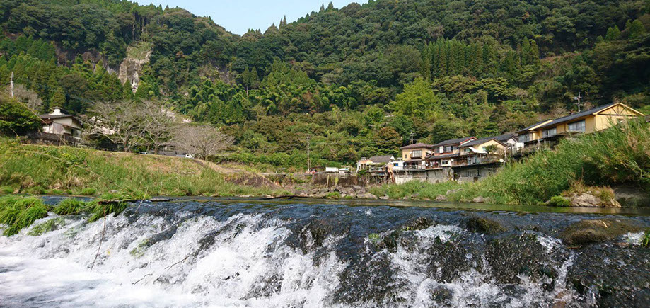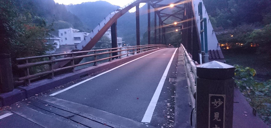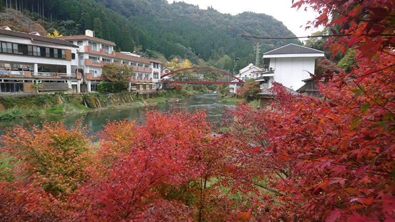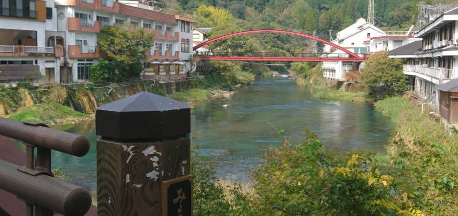 川の両岸にホテル・旅館が並ぶ妙見温泉。天降川、中津川と合流している妙見大橋