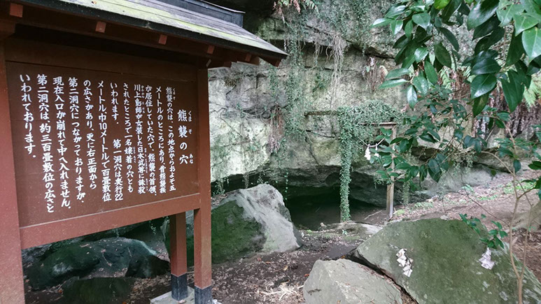 古代の南九州にはクマソと呼ばれる人々が住んでいました。クマソは熊のように猛々しく、勇ましい人々であったといわれ、古事記では「熊曽」、日本書紀では「熊襲」と書かれています。熊襲の穴はクマソ族の首領・川上タケルが住んでいたところで、女装した日本武尊(ヤマトタケルノミコト)に殺されたと伝えられています。