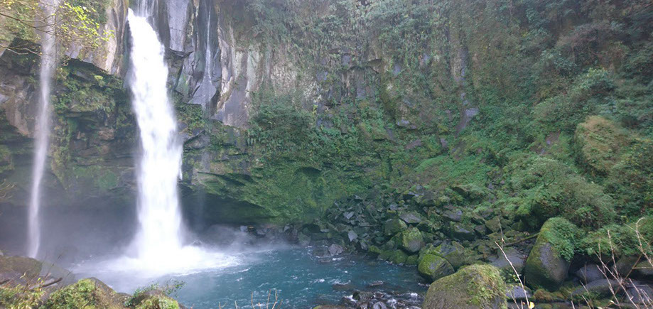 柱状節理の岩肌を流れ落ちる、高さ36mの滝。幕末に、坂本龍馬も新婚旅行で訪れ感動したといわれる滝です。県道470号沿いに駐車スペースのある滝見台より見え、滝見台より下っていく遊歩道が整備され、滝壺に近づくこともできます。